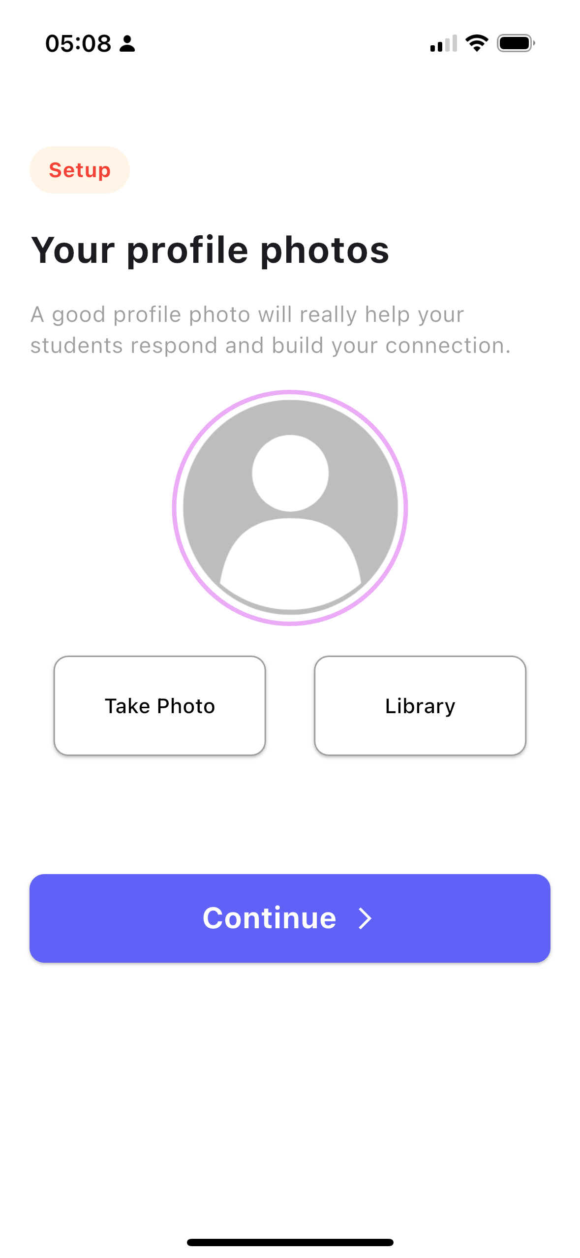 - Now you're into 'Setup' you can add your profile photo. This is very important to ensure that your students trust your invitation.